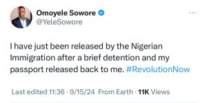 I have just been released by the Nigerian Immigration after a brief detention and my passport released back to me. #RevolutionNow, Sowore posted.