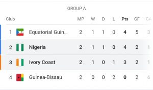 Troost Ekong’s penalty kick 10 minutes into the second half of the match secured the victory. This place them second in the Group A table with a tally of four points, with Equatorial Guinea, who had earlier today defeated Guinea-Bissau 4 goals to two.