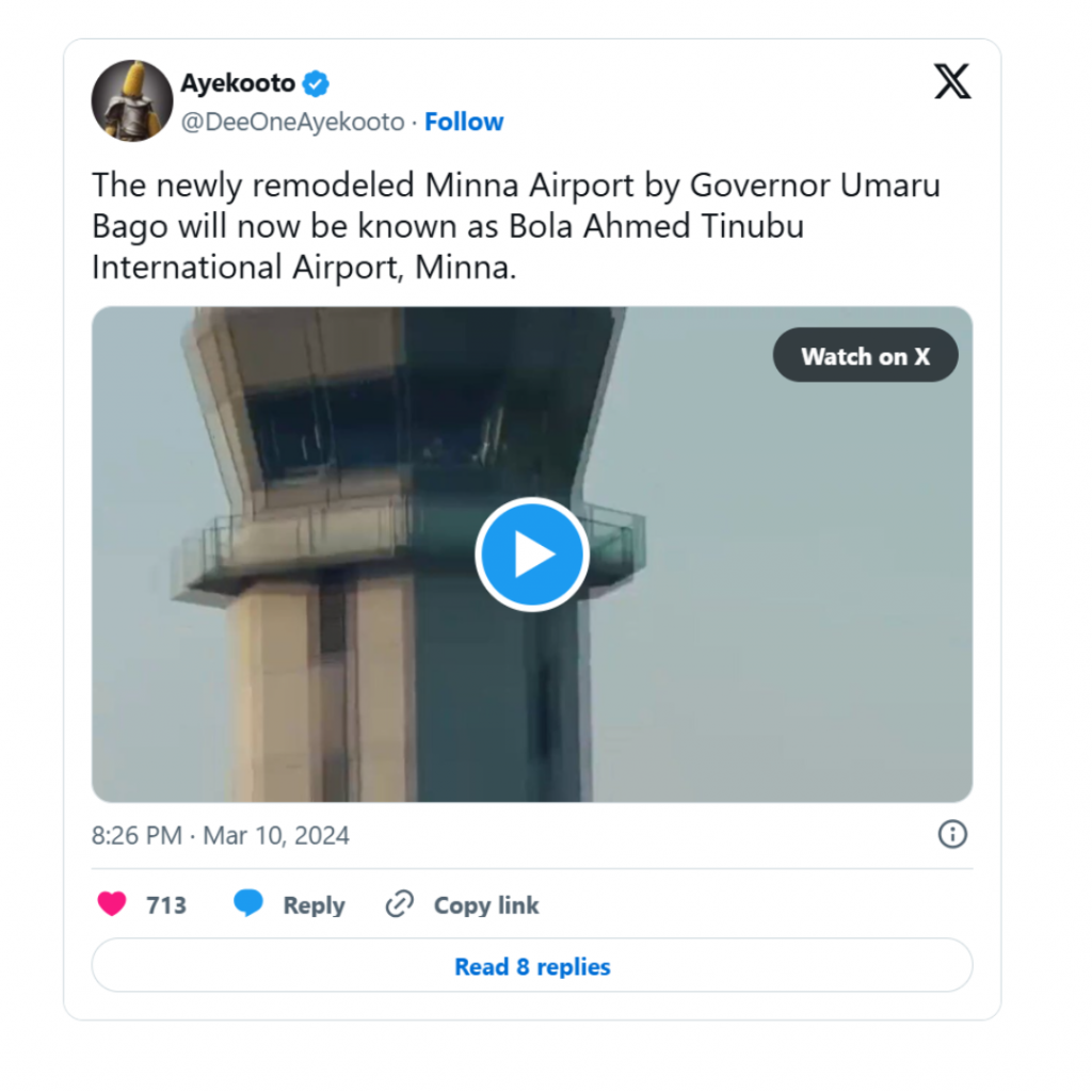 On March 11, 2024, the Governor of Niger State, Umar Bago, renamed the Abubakar Imam International Airport in Minna after Tinubu.