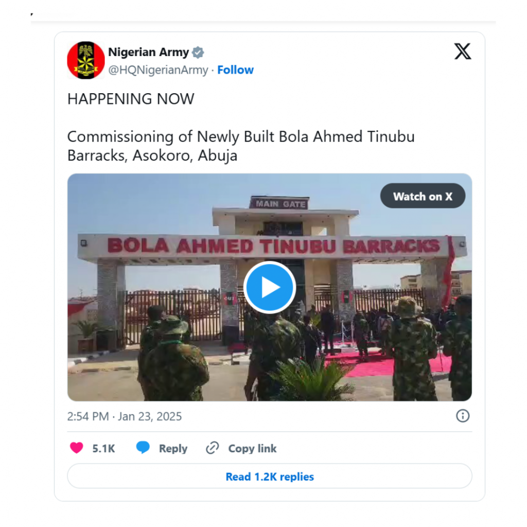 While the Bill to create a “Bola Ahmed Tinubu Federal University of Nigerian Languages” passed a first-reading stage at the House of Representatives in 2024, the creation of Bola Ahmed Tinubu Barracks came to shore on January 23, 2025, as the Nigerian Army celebrated the commissioning of a newly built barrack(s) in Asokoro, Abuja.