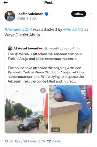 The Nigerian Police attacked the Arbaeen Symbolic Trek with teargas and gunshots in Wuse District, Abuja, today. Ealier reports suggest that one person has been shot dead during the unrest.