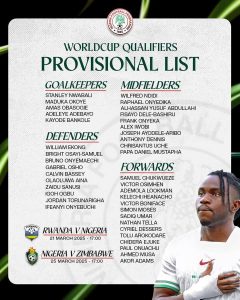Nigeria’s Super Eagles head coach, Eric Chelle, has announced a 39-man provisional squad for the 2026 FIFA World Cup qualifiers against Rwanda and Zimbabwe. The crucial fixtures will see the Nigerian team face a must-win situation to revive their qualification hopes. The list includes a mix of experienced players and fresh talents.