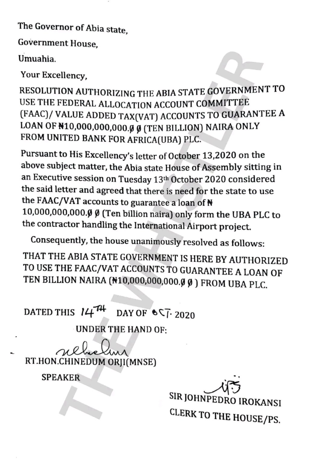 “The ISPO instructed United Bank for Africa to debit its ABSG Federation Account Allocation Committee/Value Added Tax Accounts with a repayment amount of ₦406,620,817.24 for a period of 30 months, and credit the contractor’s account domiciled with UBA the ₦10bn term loan.