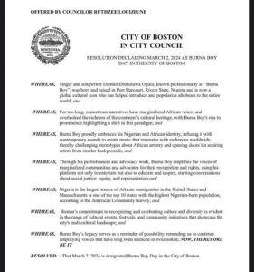 This proclamation, announced by Councilor Ruthzee Louijeune in a press release, underscores the city’s recognition of Burna Boy’s profound impact on advancing African culture and ideals through his music.